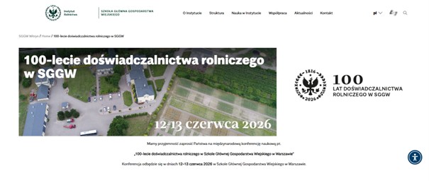 Serdecznie zapraszamy na międzynarodową konferencję naukową „100-lecie Doświadczalnictwa Rolniczego w Szkole Głównej Gospodarstwa Wiejskiego w Warszawie” (“100th Anniversary of Agricultural Experimentation at the Warsaw University of Life Sciences – SGGW”). Konferencja odbędzie się w dniach 12–13 czerwca 2026 r. w Szkole Głównej Gospodarstwa Wiejskiego w Warszawie.